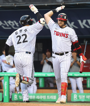 [스포티비뉴스=잠실, 곽혜미 기자] 2025 신한 SOL Bank KBO리그 LG 트윈스와 한화 이글스의 경기가 28일 오후 서울 송파구 잠실야구장에서 열렸다. 4회말 1사 LG 김현수가 솔로포를 날리고 오스틴과 기쁨을 나누고 있다.