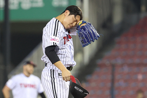 [스포티비뉴스=잠실, 곽혜미 기자] 2025 신한 SOL Bank KBO리그 LG 트윈스와 한화 이글스의 경기가 28일 오후 서울 송파구 잠실야구장에서 열렸다. 연장 11회초 2사 1루 상황에서 한화 채은성에게 역전 투런포를 허용한 LG 박명근이 아쉬워하고 있다.