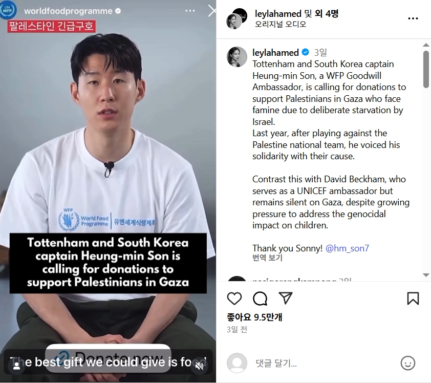 'leylahamed'란 사용자는 출연 영상을 게재하며 "토트넘과 대한민국 주장인 손흥민 WFP 홍보대사가 기근을 겪는 팔레스타인 가자지구 지역민을 지원하기 위한 기부를 촉구하고 있다. 유니세프 대사로 활동하지만 가자지구에 대해선 침묵하는 데이비드 베컴과 대조적이다. 고마워요 소니"라며 감사한 마음을 적극 표했다.
