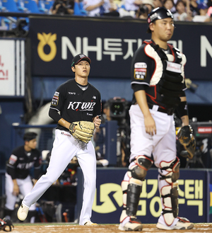 [스포티비뉴스=잠실, 곽혜미 기자] 2025 신한 SOL Bank KBO리그 LG 트윈스와 KT 위즈의 경기가 30일 오후 서울 송파구 잠실야구장에서 열렸다. 7회말 무사 1,3루 LG 문성주의 타석 때 나온 KT 전용주의 1루 악송구에 3루 주자 박해민이 득점하자 전용주가 아쉬워하고 있다.