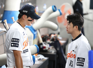 [스포티비뉴스=대전, 곽혜미 기자] 2025 신한 SOL Bank KBO리그 한화 이글스와 KT 위즈의 경기가 5일 오후 대전 한화생명 볼파크에서 열렸다. 8회초 2사 만루 상황 KT 강백호에게 싹쓸이 3타점 적시타를 허용한 한화 김서현이 아쉬워하자 최재훈이 위로하고 있다.