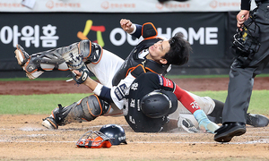 [스포티비뉴스=대전, 곽혜미 기자] 2025 신한 SOL Bank KBO리그 한화 이글스와 KT 위즈의 경기가 7일 오후 대전 한화생명 볼파크에서 열렸다. 8회초 무사 1,2루 KT 김상수의 적시타 때 1루 주자 황재균이 홈쇄도를 시도하다 한화 포수 최재훈과 충돌하고 있다. 황재균은 아웃.