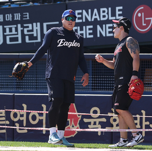 [스포티비뉴스=잠실, 곽혜미 기자] 2025 신한 SOL Bank KBO리그 LG 트윈스와 한화 이글스의 경기가 10일 오후 서울 송파구 잠실야구장에서 열린다. 한화 류현진과 LG 박동원이 대화를 나누고 있다.