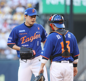 [스포티비뉴스=잠실, 곽혜미 기자] 2025 신한 SOL Bank KBO리그 LG 트윈스와 한화 이글스의 경기가 10일 오후 서울 송파구 잠실야구장에서 열렸다. 2회초 2사 만루 상황에서 한화 문동주가 최재훈과 대화를 나누고 있다.