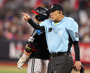 [스포티비뉴스=수원, 곽혜미 기자] 2025 신한 SOL Bank KBO리그 KT 위즈와 LG 트윈스의 경기가 12일 오후 수원 KT위즈파크에서 열렸다. 8회초 1사 1루에서 박기택 주심이 LG 박동원의 타구를 2루타로 정정하고 있다.