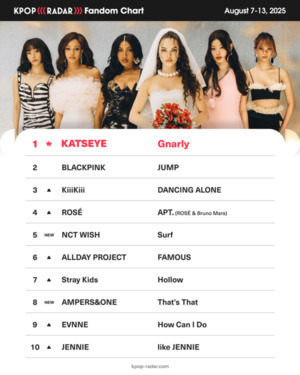 위클리 팬덤 차트는 한 주간 팬덤 지표가 가장 크게 성장한 아티스트를 증감률 기준으로 순위를 매기는 차트다. 15일 발표된 최신 차트에 따르면, 캣츠아이는 지난 4월 발매한 곡 ‘날리(Gnarly)’로 지난주에 이어 1위를 차지했다.