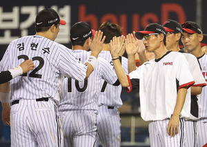 [스포티비뉴스=잠실, 곽혜미 기자] 2025 신한 SOL Bank KBO리그 LG 트윈스와 롯데 자이언츠의 경기가 19일 오후 서울 송파구 잠실야구장에서 열렸다. 5-2로 승리한 LG 염경엽 감독과 김현수가 하이파이브를 하고 있다.