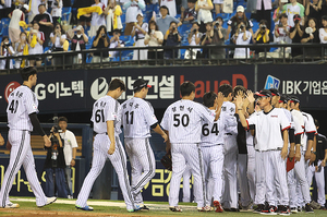 [스포티비뉴스=잠실, 곽혜미 기자] 2025 신한 SOL Bank KBO리그 LG 트윈스와 롯데 자이언츠의 경기가 20일 오후 서울 송파구 잠실야구장에서 열렸다. 5-3으로 승리한 LG 염경엽 감독이 선수들과 하이파이브를 하고 있다.