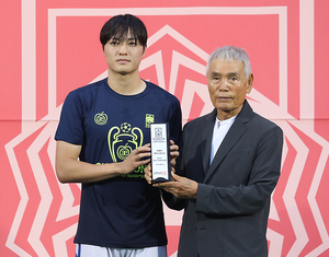 이회택 최우수선수상을 수상한 단국대 조민서가 이회택 회장과 기념 촬영을 하고 있다.