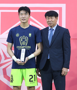 김병지 GK상을 수상한 단국대 강태웅이 대한축구협회 김현태 경기위원장과 기념 촬영을 하고 있다.