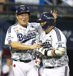 [스포티비뉴스=잠실, 곽혜미 기자] 2025 신한 SOL Bank KBO리그 두산 베어스와 LG 트윈스의 경기가 10일 오후 서울 송파구 잠실야구장에서 열렸다. 2회말 1사 2루 상황에서 두산 김기연이 선취 투런포를 날리고 양의지의 축하를 받고 있다.