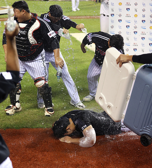 [스포티비뉴스=잠실, 곽혜미 기자] 2025 신한 SOL Bank KBO리그 두산 베어스와 LG 트윈스의 경기가 10일 오후 서울 송파구 잠실야구장에서 열렸다. 8-4로 승리한 LG 손주영이 10승을 달성하며 물세례를 받고 있다.