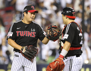 [스포티비뉴스=잠실, 곽혜미 기자] 2025 신한 SOL Bank KBO리그 두산 베어스와 LG 트윈스의 경기가 10일 오후 서울 송파구 잠실야구장에서 열렸다. 8-4로 승리한 LG 함덕주, 박동원이 하이파이브를 하고 있다.