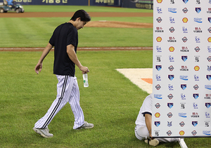 [스포티비뉴스=잠실, 곽혜미 기자] 2025 신한 SOL Bank KBO리그 두산 베어스와 LG 트윈스의 경기가 10일 오후 서울 송파구 잠실야구장에서 열렸다. 8-4로 승리한 LG 임찬규가 수훈 인터뷰를 하고 있는 손주영의 뒤로 가고 있다.