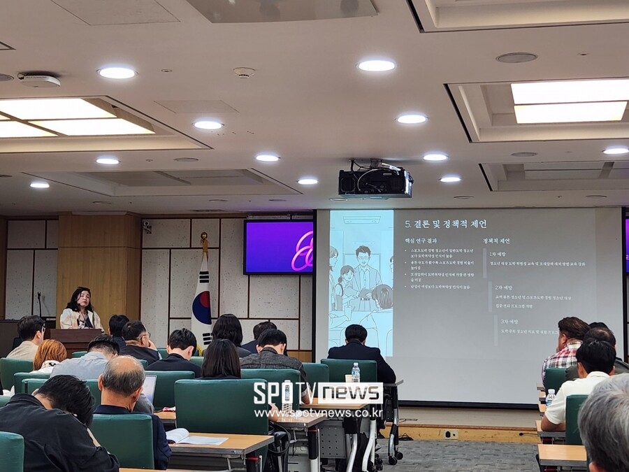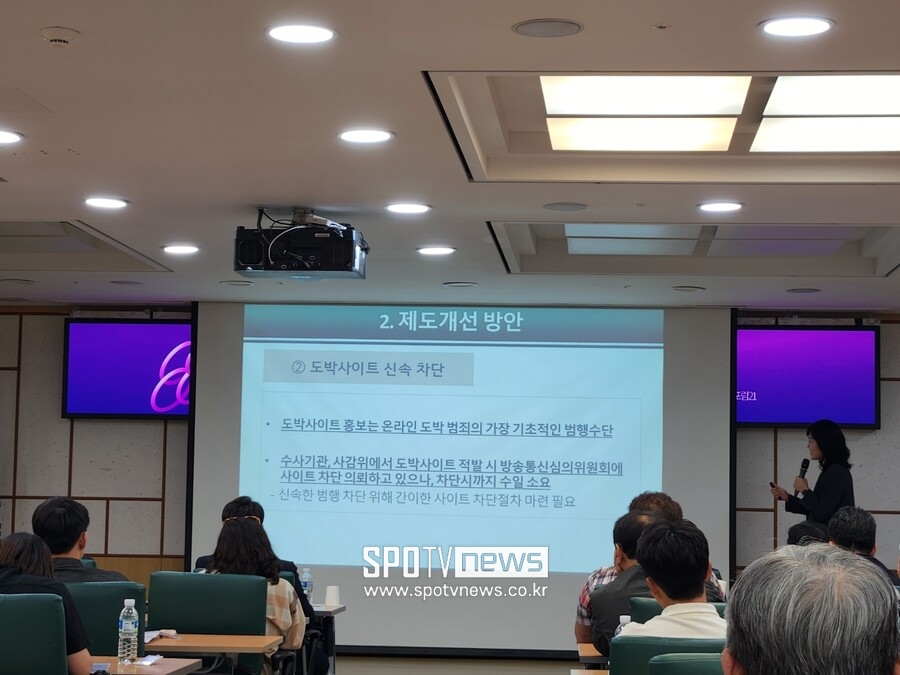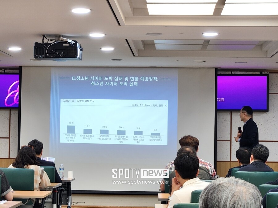 주제 발표에서 조윤오 동국대 경찰행정학부 교수는 2024년 한국도박문제예방치유원에서 발표한 청소년 도박 실태를 인용, 국내 청소년 4.3%가 평생 한 번 이상의 도박을 경험했고 이 중 19%는 최근 6개월 내 도박을 계속한다고 소개하며 "청소년들이 좋아하는 야구, 축구와 같은 스포츠 게임을 기반으로 한 불법 도박은 친구끼리 집단으로 하는 경우가 많다. 이를 단순한 놀이나 오락으로 인식하는 경향이 있다"라고 설명했다.