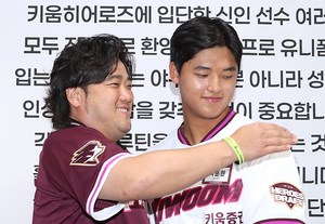 [스포티비뉴스=고척, 곽혜미 기자] 키움 히어로즈 2026 신인선수 환영 행사 '영웅의 첫걸음'이 24일 오후 서울 구로구 고척스카이돔에서 열렸다. 전체 1순위로 키움에 지명된 박준현이 아버지 박석민과 기념 촬영을 하고 있다.