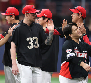 [스포티비뉴스=고척, 곽혜미 기자] 2025 신한 SOL Bank KBO리그 키움 히어로즈와 KIA 타이거즈의 경기가 24일 오후 서울 구로구 고척스카이돔에서 열렸다. 2-0으로 승리한 KIA 올러가 하이파이브를 하고 있다.
