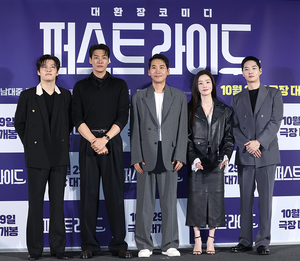 [스포티비뉴스=서울, 곽혜미 기자] 영화 '퍼스트 라이드' 제작보고회가 25일 오전 서울 용산구 CGV용산아이파크몰에서 열렸다. 강하늘, 김영광, 남대중 감독, 강영석, 한선화가 포즈를 취하고 있다.