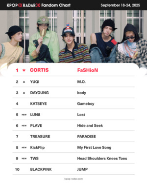 위클리 팬덤 차트는 한 주간 팬덤 지표가 가장 크게 성장한 아티스트를 증감률 기준으로 순위를 매기는 차트. 26일 발표된 차트에 따르면, 코르티스는 데뷔 앨범 수록곡 ‘패션’으로 정상 자리를 지켰다.