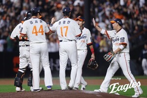 [스포티비뉴스=대전, 신원철 기자] 창단 40주년을 맞이한 독수리 군단이 의미있는 시즌에 역사에 남을 기록을 썼다. 바로 창단 후 시즌 최다승 타이기록. 아직 5경기가 남아있는 만큼 신기록이 유력하다.