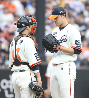 [스포티비뉴스=대전, 곽혜미 기자] 2025 신한 SOL Bank KBO리그 한화 이글스와 LG 트윈스의 경기가 27일 오후 대전 한화생명 볼파크에서 열렸다. 1회초 한화 선발 문동주와 포수 최재훈이 대화를 나누고 있다.
