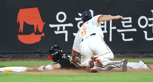 [스포티비뉴스=대전, 곽혜미 기자] 2025 신한 SOL Bank KBO리그 한화 이글스와 LG 트윈스의 경기가 27일 오후 대전 한화생명 볼파크에서 열렸다. 7회초 무사 1루 LG 오지환의 안타 때 3루까지 진루를 시도한 1루 주자 구본혁이 한화 3루수 노시환에게 태그아웃 되고 있다.