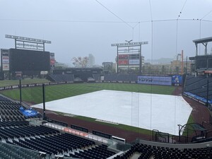 한화생명볼파크에는 밤새 대형 방수포가 설치돼 있었다. 방수포 바깥쪽 흙으로 덮인 구역에는 이미 물웅덩이가 여럿 생겼다. 한화생명볼파크는 KBO리그 경기가 열리는 야구장 가운데 최고의 배수 능력을 자랑하는 곳이다. 지난 6월 25일 대전 LG전에서는 한 시간 가량 폭우가 쏟아졌는데도 단 27분 만에 그라운드 정비가 끝났다.