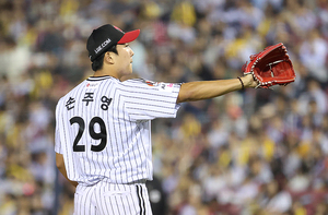 [스포티비뉴스=잠실, 곽혜미 기자] 2025 신한 SOL Bank KBO리그 LG 트윈스와 NC 다이노스의 경기가 1일 오후 서울 송파구 잠실야구장에서 열렸다. 5회초 1사 만루 상황에서 LG 손주영이 아쉬워하고 있다.