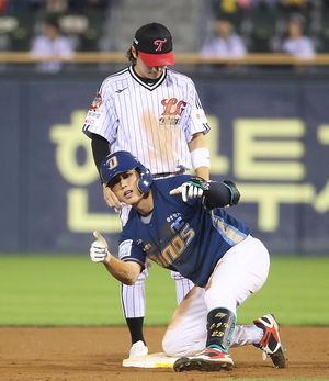 [스포티비뉴스=잠실, 곽혜미 기자] 2025 신한 SOL Bank KBO리그 LG 트윈스와 NC 다이노스의 경기가 1일 오후 서울 송파구 잠실야구장에서 열렸다. 8회초 선두타자로 나선 NC 천재환이 2루타를 날리고 세리머니를 하고 있다.