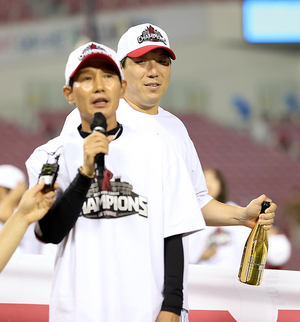 염경엽 감독과 김현수가 기뻐하고 있다.