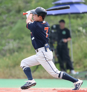[스포티비뉴스=곤지암, 곽혜미 기자] '2025 KBSA리그' 연천 미라클과 화성 코리요의 결승 2차전이 2일 오후 경기도 광주시 곤지암읍 팀업캠퍼스 야구장에서 열렸다. 3회초 2사 화성 코리요 김동호가 안타를 날리고 있다.