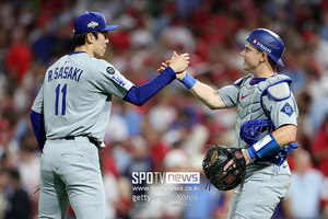 사사키는 5일 미국 펜실베이니아주 필라델피아 시티즌스뱅크파크에서 열린 '2025 메이저리그 포스트시즌' 필라델피아 필리스와 내셔널리그 디비전시리즈 1차전에서 5-3으로 앞선 9회 마운드에 올랐다. 2점의 여유가 있었지만 주자가 쌓이면 한 방에 역전을 내줄 수도 있는 만만치 않은 상황이었다.