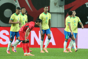 [스포티비뉴스=서울월드컵경기장, 곽혜미 기자] 대한민국과 브라질의 평가전이 10일 오후 서울월드컵경기장에서 열렸다. 전반전 2골을 넣은 브라질 선수들이 기뻐하고 있다.