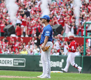 [스포티비뉴스=인천, 곽혜미 기자] 2025 신한 SOL뱅크 KBO 포스트시즌 SSG와 삼성의 준플레이오프 2차전이 11일 오후 인천 SSG랜더스필드에서 열렸다. 3회말 2사 2루 상황에서 SSG 최정에게 1타점 적시타를 허용한 삼성 가라비토가 아쉬워하고 있다.