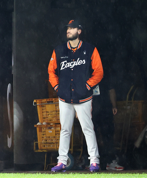 [스포티비뉴스=대전, 곽혜미 기자] 2025 신한 SOL뱅크 KBO 포스트시즌 한화와 삼성의 플레이오프 1차전이 17일 오후 대전 한화생명 볼파크에서 열린다. 경기 전 갑작스러운 폭우에 한화 선발 폰세가 아쉬운 표정을 짓고 있다.