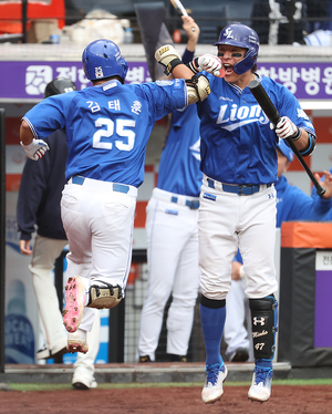 [스포티비뉴스=대전, 곽혜미 기자] 2025 신한 SOL뱅크 KBO 포스트시즌 한화와 삼성의 플레이오프 2차전이 18일 오후 대전 한화생명 볼파크에서 열렸다. 4회초 선두타자로 나선 삼성 김태훈이 역전 솔로포를 날린 후 강민호와 기쁨을 나누고 있다.
