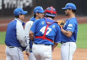 [스포티비뉴스=대전, 곽혜미 기자] 2025 신한 SOL뱅크 KBO 포스트시즌 한화와 삼성의 플레이오프 2차전이 18일 오후 대전 한화생명 볼파크에서 열렸다. 2회말 삼성 선발 가라비토가 코치와 상의를 하고 있다.