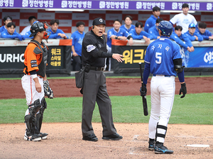 [스포티비뉴스=대전, 곽혜미 기자] 2025 신한 SOL뱅크 KBO 포스트시즌 한화와 삼성의 플레이오프 2차전이 18일 오후 대전 한화생명 볼파크에서 열렸다. 3회초 무사 1,3루 상황에서 삼성 구자욱이 한화 선발 폰세의 인터벌이 너무 길다며 항의하자 박기택 주심이 주의를 주고 있다.