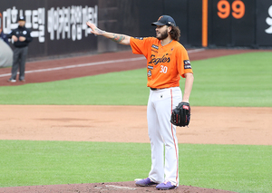 [스포티비뉴스=대전, 곽혜미 기자] 2025 신한 SOL뱅크 KBO 포스트시즌 한화와 삼성의 플레이오프 2차전이 18일 오후 대전 한화생명 볼파크에서 열렸다. 3회초 무사 1,3루 상황에서 삼성 구자욱이 한화 선발 폰세의 인터벌이 너무 길다며 항의하자 폰세가 당황하고 있다.