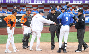 [스포티비뉴스=대전, 곽혜미 기자] 2025 신한 SOL뱅크 KBO 포스트시즌 한화와 삼성의 플레이오프 2차전이 18일 오후 대전 한화생명 볼파크에서 열렸다. 3회초 무사 1,3루 상황에서 삼성 구자욱이 한화 선발 폰세의 인터벌이 너무 길다며 항의하자 한화 김경문 감독이 그라운드로 나섰다.