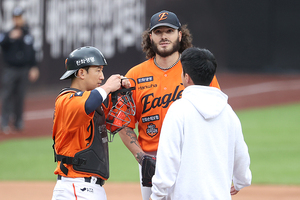 [스포티비뉴스=대전, 곽혜미 기자] 2025 신한 SOL뱅크 KBO 포스트시즌 한화와 삼성의 플레이오프 2차전이 18일 오후 대전 한화생명 볼파크에서 열렸다. 3회초 한화 선발 폰세가 포수 최재훈과 대화를 하고 있다.
