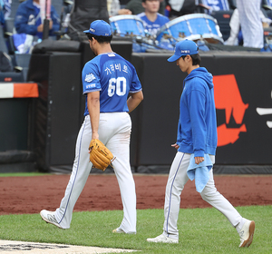 [스포티비뉴스=대전, 곽혜미 기자] 2025 신한 SOL뱅크 KBO 포스트시즌 한화와 삼성의 플레이오프 1차전이 18일 오후 대전 한화생명 볼파크에서 열렸다. 4회말 1사 1루 상황에서 삼성 선발 가라비토가 교체되고 있다.