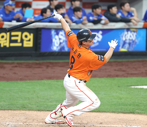 [스포티비뉴스=대전, 곽혜미 기자] 2025 신한 SOL뱅크 KBO 포스트시즌 한화와 삼성의 플레이오프 1차전이 18일 오후 대전 한화생명 볼파크에서 열렸다. 8회말 2사 1루 상황에서 한화 노시환이 안타를 날리고 있다.