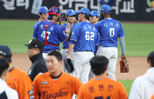 [스포티비뉴스=대전, 곽혜미 기자] 2025 신한 SOL뱅크 KBO 포스트시즌 한화와 삼성의 플레이오프 2차전이 19일 오후 대전 한화생명 볼파크에서 열렸다. 7-3으로 승리한 삼성 선수들이 기뻐하고 있다.