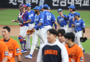 [스포티비뉴스=대전, 곽혜미 기자] 2025 신한 SOL뱅크 KBO 포스트시즌 한화와 삼성의 플레이오프 2차전이 19일 오후 대전 한화생명 볼파크에서 열렸다. 7-3으로 승리한 삼성 선수들이 기뻐하고 있다.