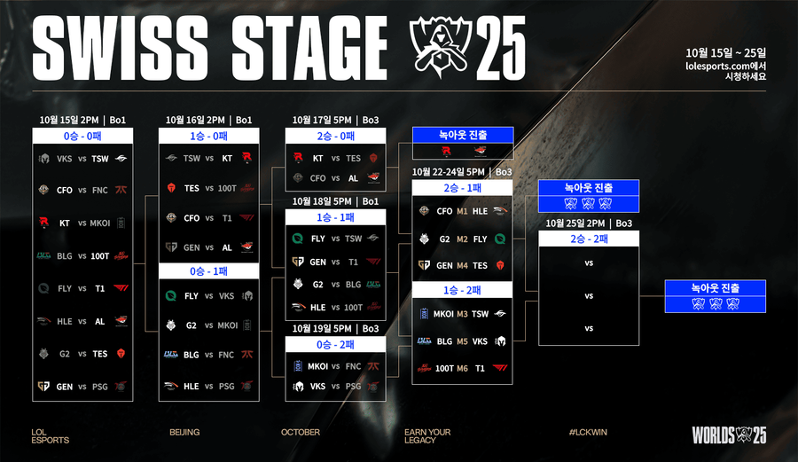현재 2025 월드 챔피언십에 출전한 LCK팀 가운데 가장 페이스가 좋지 않은 팀은 T1이다. 14일 LPL 4번 시드인 인빅터스 게이밍(Invictus Gaming)과 플레이-인에서 만나면서 다른 팀들보다 먼저 경기를 치른 T1은 인빅터스 게이밍을 세트 스코어 3대1로 격파하고 스위스 스테이지 막차를 탔다. 15일 첫 경기에서 LTA(아메리카스) 1번 시드인 플라이퀘스트(FlyQuest)를 완파하면서 분위기를 끌어 올리는 듯했던 T1은 LCP 1번 시드인 CTBC 플라잉 오이스터에게 충격적인 패배를 당한 뒤 18일 젠지를 만나 또 다시 패배를 기록하며 1승 2패조에 편성됐다.