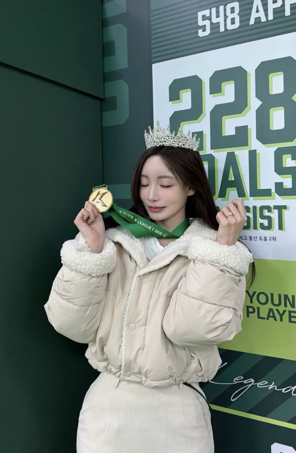 곽 아나운서는 우승 메달을 목에 걸고 찍은 사진은 물론, 송민규가 무릎을 꿇고 자신에게 우승 트로피를 건네는 포즈의 사진도 함께 공개했다.