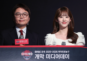 [스포티비뉴스=외발산동, 곽혜미 기자] BNK금융 2025-2026 여자프로농구 개막 미디어데이가 10일 오후 서울 강서구 외발산동 메이필드 호텔에서 열렸다. 김기웅, 최서임 아나운서가 사회를 보고 있다.