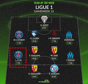 이강인이 이름을 올렸다. 이강인은 평점 7.93으로 오른쪽 측면 미드필더 자리에 배치됐다. 이강인과 함께 PSG 동료 워렌 자이르-에메리(평점 7.59)도 포함됐다.