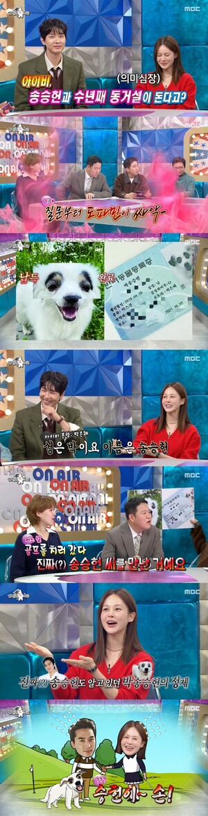 이내 아이비의 반려견 사진이 공개됐는데, 한 눈에도 송승헌을 연상시키는 숯검댕 눈썹이 시선을 사로잡아 왜 '송승헌'이란 이름을 갖게 됐는지를 납득시켰다. 본면이 박은혜인 아이비는 "제가 박씨라 박송승헌"이라고 너스레를 떨었다.